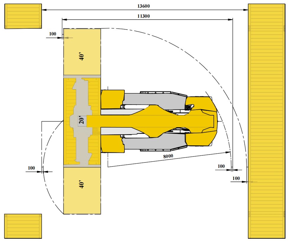 Spreader:XCMG spreader is suitable for handling 20' and 40' standard containers. Telescoping, side shift and rotating function, as well as twist lock control are available. Rated lifting capacity: 45 t. Side shift: ±800 mm. Rotation angle: -105°~+195°
