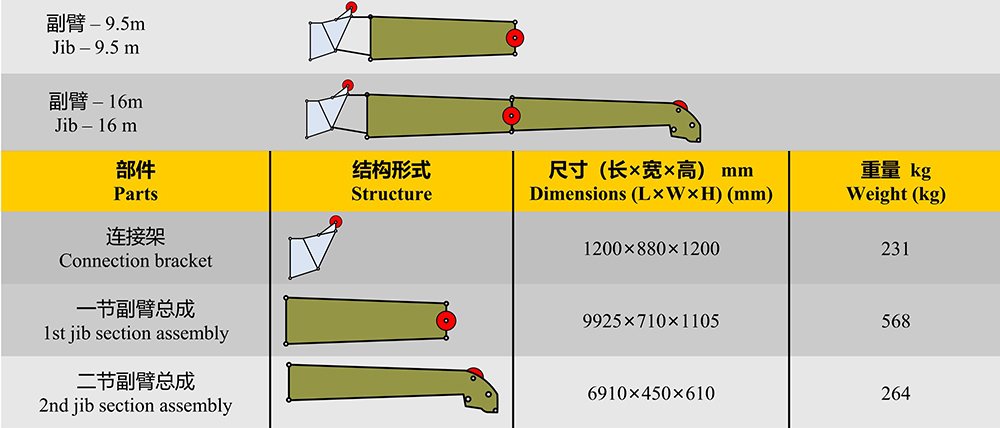 Fixed jib:Two-section lattice jib, welded structure.Three offset angles of 0 , 15 and 30 . Fixed jib length: 9.5 m~16 m.