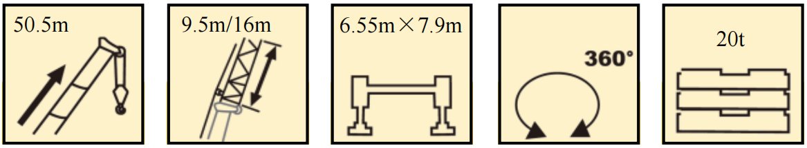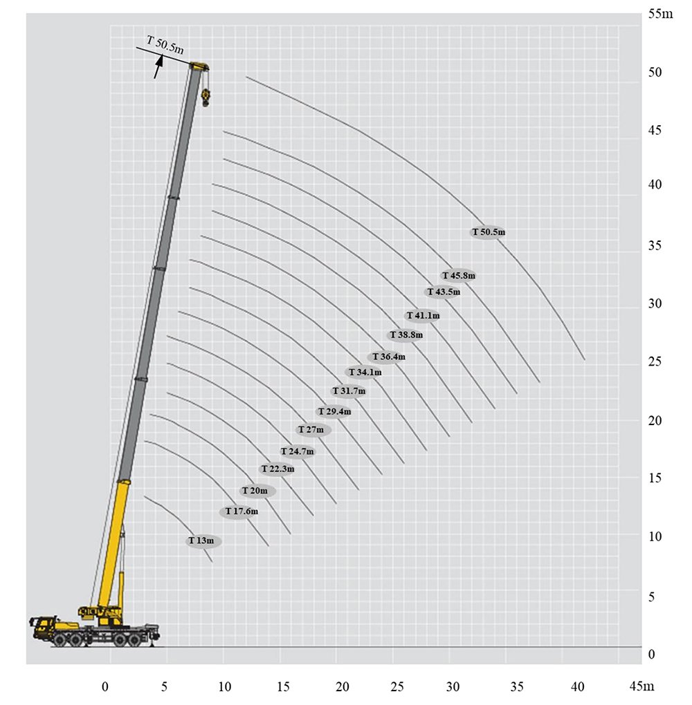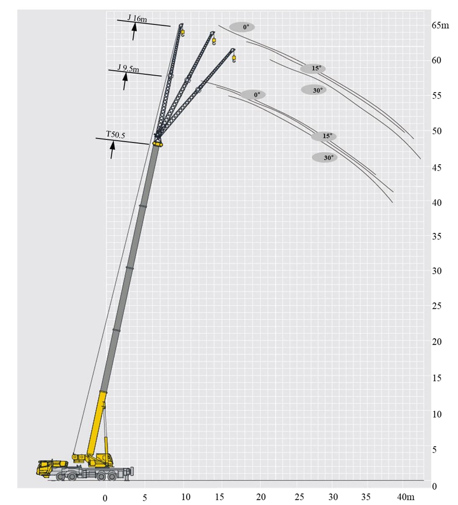 Function description:5-section boom of 50.5 m, fixed jib of 16 m.