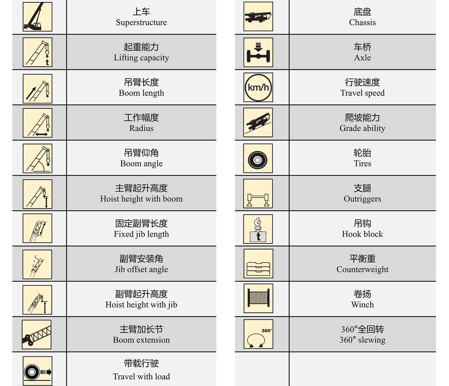 Before beginning lifting, the operator should know the weight of the load to be lifted and its working range, and should then select proper working conditions. Never operate the crane beyond the limit shown in the chart. The working condition should be depended on the smaller value when the radius and boom length falls between two adjacent values.