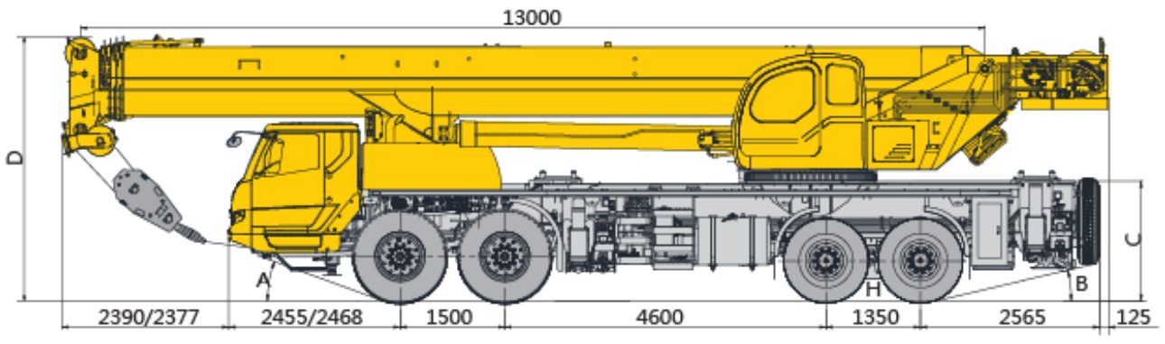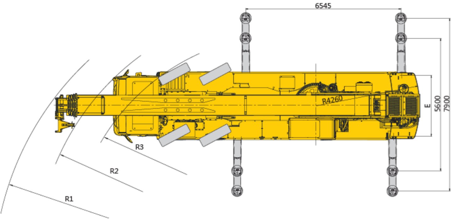 2 t fixed counterweight slab, 55 t and 5 t hook blocks, auxiliary sheave, spare tire and its bracket, and counterweight bracket are carried at turntable tail; counterweight slab 8 t + 5 t + 5 t, jib and front outrigger float are removed. Short-distance job site transfer: max. travel speed is 10 km/h, carry the 55 t hook block, jib, 20 t counterweight. Steer & Driving type: 8×4×4; Tire specification: 1st and 2nd axles: 385/95R25, 3rd and 4th axles:12.00R24 or 325/95R24.